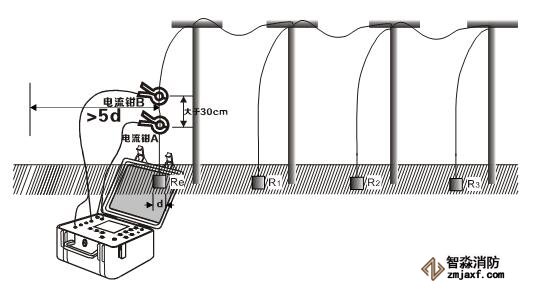 雙鉗法適合測量獨立多點接地系統的情況,如下圖,在多點接地系統無需打地樁測量接地電阻值,將兩個電流鉗A和B同時鉗入被測接地引下線中,注意兩個電流鉗方向要一致并且保持間距大于30cm,兩個電流鉗不得互換,否則會產生誤差。