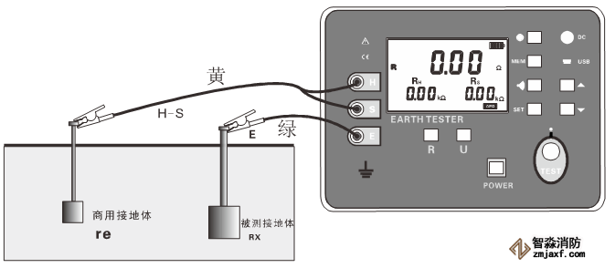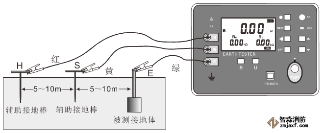 從被測物體開始,每隔5~10米分別將輔助接地棒呈一直線插入大地,將接地測試線(紅、黃、綠)從儀表的H、S、E接口開始對應連接到輔助電流極H、輔助電壓極S、被測接地極E上。如圖示: