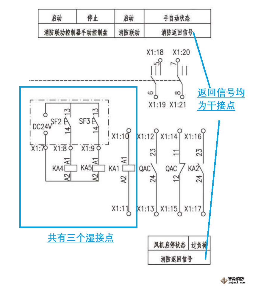 聯(lián)動(dòng)觸發(fā)信號(自動(dòng)啟動(dòng),總線) 和手動(dòng)控制信號(手動(dòng)啟、停,專線),兩種信號均為DC24V有源觸點(diǎn),消防信號中間繼電器設(shè)于消防水泵控制箱內(nèi),滿足GB50116-2013第4.1.1條,4.1.3條。