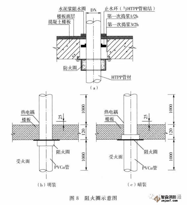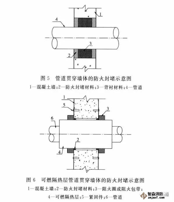 3.0.11 阻火圈或阻火包帶安裝時,是將阻火圈或阻火包帶套在或纏繞在硬聚氯乙烯等塑料管道外壁上。火災(zāi)時,阻火圈或阻火包帶的阻燃膨脹芯材受熱迅速膨脹后擠壓管道,使貫穿孔口被封堵,起到阻止火勢和煙氣沿?zé)g的管道蔓延的作用。阻火圈或阻火包帶有明裝和暗裝兩種安裝方式,但水平貫穿墻體等的孔口的封堵應(yīng)在墻的兩側(cè)都設(shè)置阻火圈或阻火包帶,豎向貫穿樓板等的孔口的封堵,則宜在樓板下側(cè)設(shè)置阻火圈或阻火包帶。