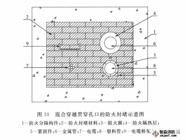 (5)管道貫穿孔口使用阻火圈或阻火包帶進(jìn)行封堵時要注意,安裝部位需位于墻體兩側(cè)或樓板下側(cè);對于多種類型貫穿物混合穿越被貫穿體的部位,在有防火封堵板材或相應(yīng)防火封堵組件中如采用阻火圈或阻火包帶,要按產(chǎn)品使用要求進(jìn)行安裝,保證遇火時不脫落。