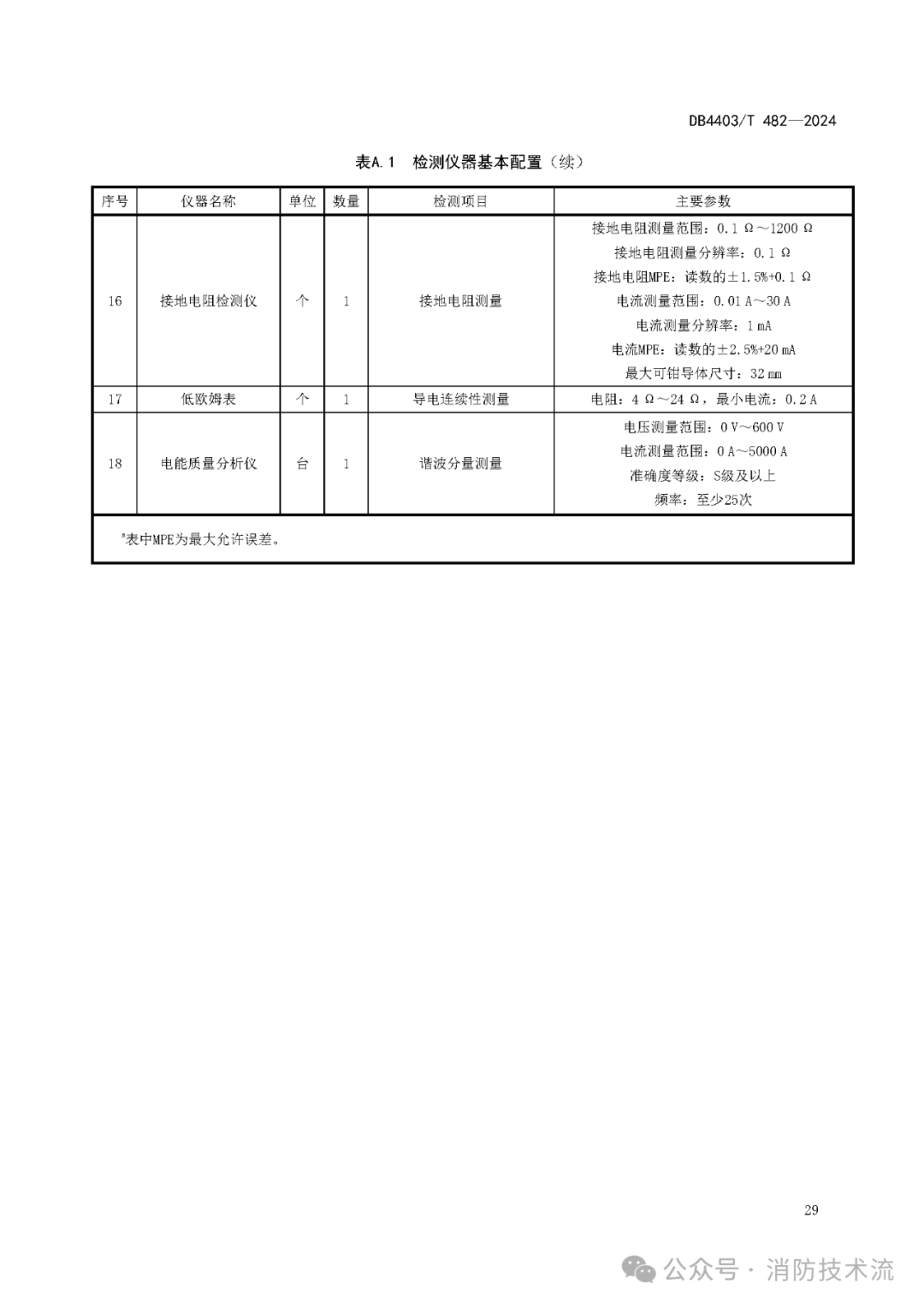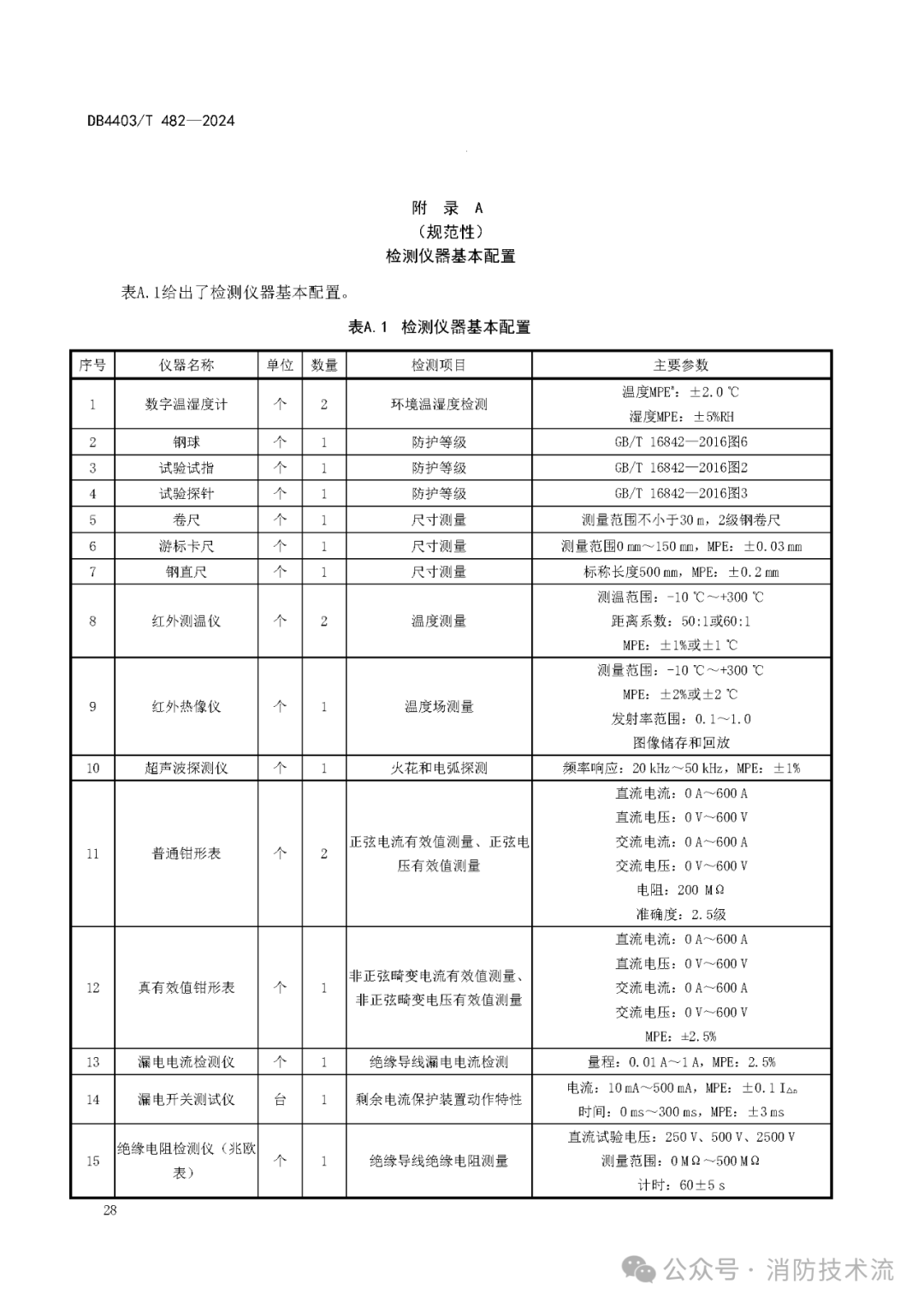 本文件規(guī)定了建筑電氣防火檢測的基本要求、檢測流程、檢測要求、建筑電氣火災(zāi)危險及其等級評定、檢測記錄、試驗報告及檔案管理。本文件適用于交流10(20)kV及以下、直流額定電壓1500 V及以下電氣防火檢測。本文件不適用于生產(chǎn)和儲存火藥、炸藥、火工品和其他有爆炸危險場所,以及井下、航空、水上場所的電氣防火檢測活動。下列文件中的內(nèi)容通過文中的規(guī)范性引用而構(gòu)成本文件必不可少的條款。其中,注日期的引用文件,僅該日期對應(yīng)的版本適用于本文件;不注日期的引用文件,其最新版本(包括所有的修改單)適用于本文件。GB/T 2099.1 家用和類似用途插頭插座 第1部分:通用要求GB/T 7260.1 不間斷電源系統(tǒng)(UPS) 第1部分:安全要求GB 8624—2012 建筑材料及制品燃燒性能分級GB/T 18487.1 電動汽車傳導(dǎo)充電系統(tǒng) 第1部分:通用要求GB/T 12325 電能質(zhì)量 供電電壓偏差GB/T 12326 電能質(zhì)量 電壓波動和閃變GB/T 13539.1 低壓熔斷器 第1部分:基本要求GB/T 13955—2017 剩余電流動作保護裝置安裝和運行GB 14050—2008 系統(tǒng)接地的型式及安全技術(shù)要求GB/T 14549 電能質(zhì)量 公用電網(wǎng)諧波GB/T 15543 電能質(zhì)量 三相電壓不平衡GB/T 15945 電能質(zhì)量 電力系統(tǒng)頻率偏差GB/T 16842—2016 外殼對人和設(shè)備的防護 檢驗用試具GB/T 16895.6—2014 低壓電器裝置 第5-52部分:電氣設(shè)備的選擇和安裝 布線系統(tǒng)(IEC 60364-5-52:2009,IDT)GB/T 31038 高電壓柴油發(fā)電機組通用技術(shù)條件GB/T 42710.1 家用和類似用途直流插頭插座 第1部分:通用要求GB 50016 建筑設(shè)計防火規(guī)范GB 50057 建筑物防雷設(shè)計規(guī)范GB/T 50065 交流電氣裝置的接地設(shè)計規(guī)范GB 50084 自動噴水滅火系統(tǒng)設(shè)計規(guī)范GB 50171—2012 電氣裝置安裝工程 盤、柜及二次回路接線施工及驗收規(guī)范GB 50217—2018 電力工程電纜設(shè)計規(guī)范GB 50303—2015 建筑電氣工程施工質(zhì)量驗收規(guī)范GB 51348—2019 民用建筑電氣設(shè)計標(biāo)準(zhǔn)電氣設(shè)備 electrical equipment用于發(fā)電、變電、輸電、配電或利用電能的設(shè)備。用電設(shè)備 current-using equipment用于將電能轉(zhuǎn)換成其他形式能量的電氣設(shè)備(3.1)。電氣裝置 electrical installation由相關(guān)電氣設(shè)備(3.1)組成的,具有為實現(xiàn)特定目的所需的相互協(xié)調(diào)的特性的組合。電氣設(shè)備(3.1)或電氣線路發(fā)生電氣故障而引發(fā)的火災(zāi)。在系統(tǒng)、裝置或設(shè)備的給定點與局部地之間進行電連接。[來源:GB/T 2900.1—2008,3.5.6]系統(tǒng)接地 system grounded將已停電的帶電部分接地(3.5)、以便在無電擊危險情況下進行作業(yè)。保護接地 protective grounding為了電氣安全,將系統(tǒng)、裝置或設(shè)備的一點或多點接地(3.5)。[來源:GB/T 2900.1—2008,3.5.9]埋入土壤或特定的導(dǎo)電介質(zhì)(例如混凝土或焦炭)中、與大地有電接觸的可導(dǎo)電部分。[來源:GB/T 2900.1—2008,3.5.17]接地導(dǎo)體 earth conductor在系統(tǒng)、裝置或設(shè)備的給定點與接地極(3.8)或接地網(wǎng)之間提供導(dǎo)電通路或部分導(dǎo)電通路的導(dǎo)體。[來源:GB/T 2900.1—2008,3.5.19]接地導(dǎo)體(3.9)和接地極(3.8)的總和。被接地體與地下零電位面之間接地引線電阻、接地器電阻、接地器與土壤之間的過渡電阻和土壤的溢流電阻總和。中性導(dǎo)體 neutral conductor[來源:GB/T 2900.1—2008,3.2.55b﹚]保護導(dǎo)體 protective conductor為了安全目的,例如電擊防護中設(shè)置的導(dǎo)體。[來源:GB/T 2900.1—2008,3.5.24]保護接地中性導(dǎo)體 PEN conductor兼有保護接地(3.7)導(dǎo)體和中性導(dǎo)體(3.12)功能的導(dǎo)體。[來源:GB/T 2900.1—2008,3.5.27]等電位聯(lián)結(jié) equipotential bonding為達到等電位,多個可導(dǎo)電部分間的電連接。[來源:GB/T 2900.1—2008,3.5.8]等電位聯(lián)結(jié)導(dǎo)體 equipotential bounding conductor用于保護等電位聯(lián)結(jié)(3.15)的保護導(dǎo)體(3.13)。剩余電流保護裝置 residual current protective device在正常運行條件下能接通、承載和分?jǐn)嚯娏鳎约霸谝?guī)定條件下當(dāng)剩余電流達到規(guī)定值時能使觸頭斷開的機械開關(guān)器件。充電設(shè)備 charging equipment以傳導(dǎo)或無線方式與電動汽車或動力蓄電池連接,為其提供電能的設(shè)備。防火分區(qū) fire compartment在建筑內(nèi)部采用防火墻(3.21)、耐火樓板及其他防火分隔設(shè)施分隔而成,能在一定時間內(nèi)防止火災(zāi)向同一建筑的其余部分蔓延的局部空間。[來源:GB/T 5907.2—2015,2.1.3]防止火災(zāi)蔓延至相鄰建筑或相鄰水平防火分區(qū)(3.20)且耐火極限不低于3.00 h的不燃性實體墻。[來源:GB/T 5907.2—2015,2.1.6]公共娛樂場所 public entertainment occupancies具有文化娛樂、健身休閑功能并向公眾開放的室內(nèi)場所。注:公共娛樂場所包括影劇院、錄像廳、禮堂等演出、放映場所,舞廳、卡拉OK廳等歌舞廳娛樂場所,具有娛樂功能的夜總會、音樂茶座、酒吧和餐飲場所,游藝、游樂場所,保齡球館、旱冰場、桑拿等娛樂場所、健身、休閑場所和互聯(lián)網(wǎng)上網(wǎng)服務(wù)營業(yè)場所。可能導(dǎo)致火災(zāi)發(fā)生或火災(zāi)危害增大的各類潛在不安全因素。4.1.1電氣設(shè)備表面應(yīng)保持清潔,電氣設(shè)備及