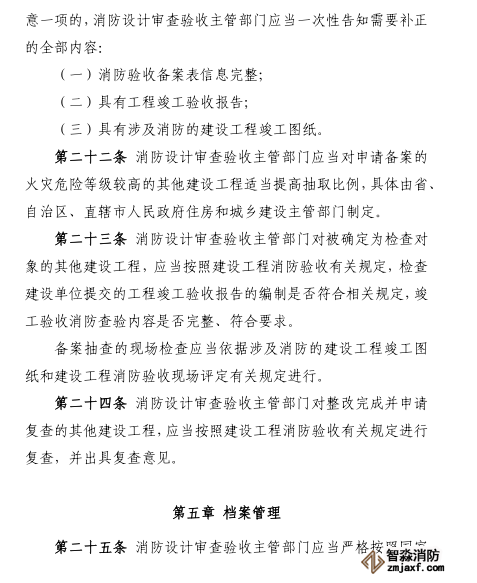 縣級以上地方人民政府住房和城鄉建設主管部門(以下簡稱消防設計審查驗收主管部門)依職責承擔本行政區域內建設工程的消防設計審查、消防驗收、備案和抽查工作。