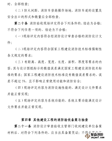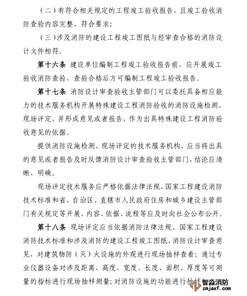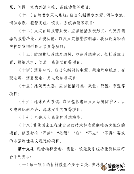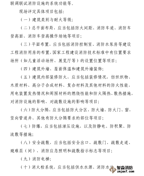 第二十九條 消防設計審查驗收主管部門受理消防驗收申請后,應當按照國家有關規定,對特殊建設工程進行現場評定?,F場評定包括對建筑物防(滅)火設施的外觀進行現場抽樣查看;通過專業儀器設備對涉及距離、高度、寬度、長度、面積、厚度等可測量的指標進行現場抽樣測量;對消防設施的功能進行抽樣測試、聯調聯試消防設施的系統功能等內容。