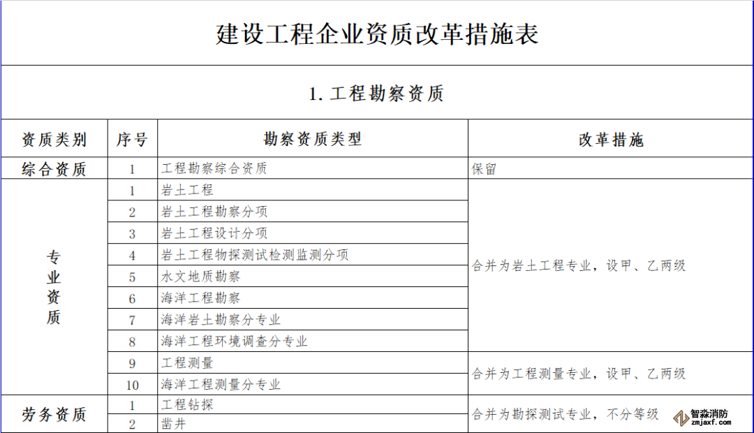 取消海洋行業及專業資質,相關企業可以換發相近行業資質。整合原化工石化醫藥、石油天然氣、電力、市政行業中的專業資質,資質等級壓減為甲、乙兩級,原丙級資質并入相應專業乙級資質;取消其他行業的專業資質,并入相應行業資質,原甲、乙級專業資質并入相應等級的行業資質,原丙級專業資質并入乙級行業資質。