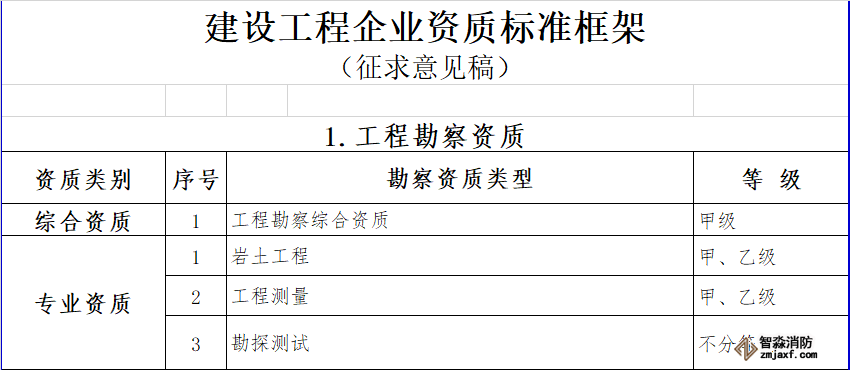 (一)工程勘察資質。保留綜合資質。將4類專業資質及勘察勞務資質整合為巖土工程、工程測量、勘探測試等3類專業資質。專業資質等級壓減為甲、乙兩級(勘探測試專業資質不分等級),原丙級資質并入相應專業乙級資質。