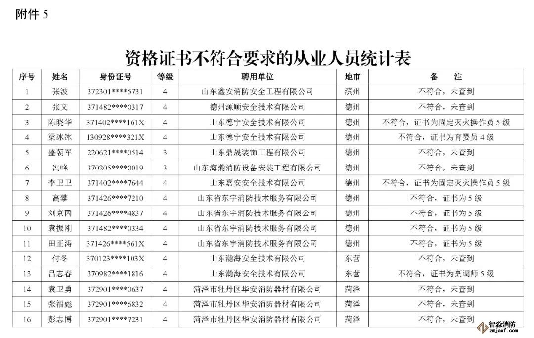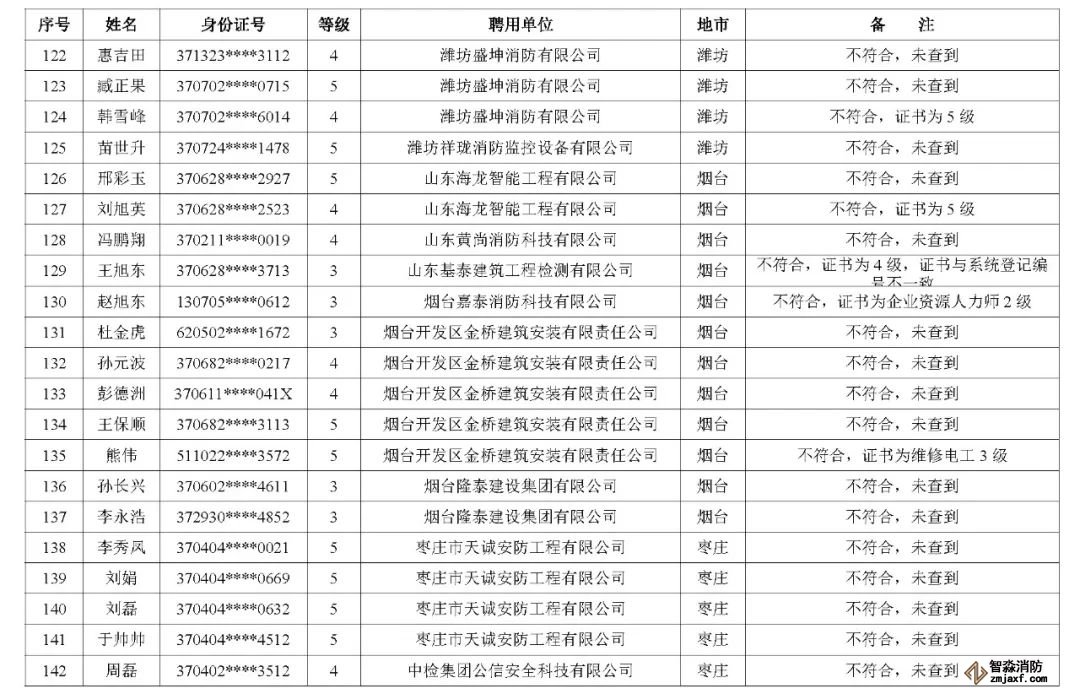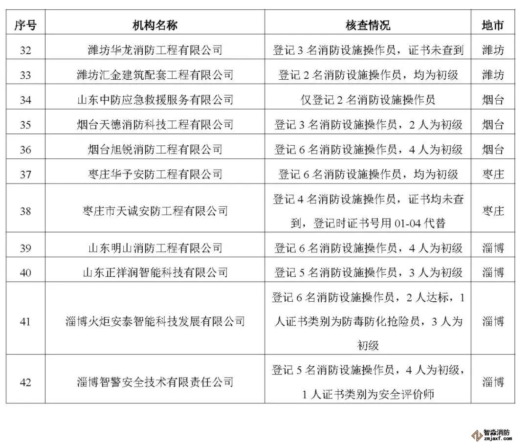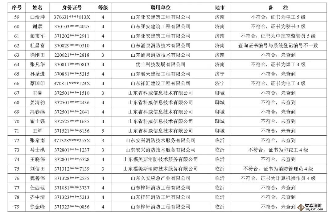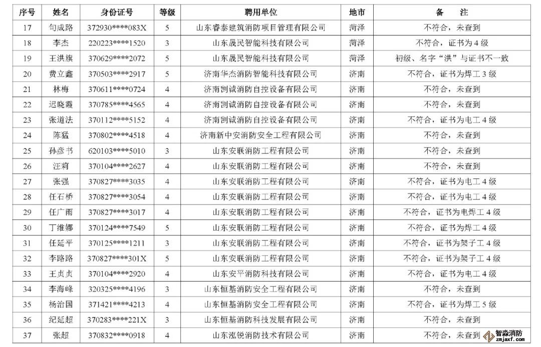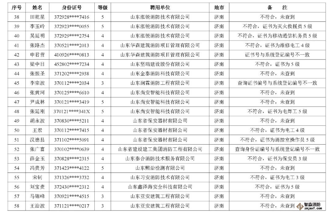 近日,山東省消防救援總隊辦公室通報了對消防技術服務機構從業人員資格核查情況: